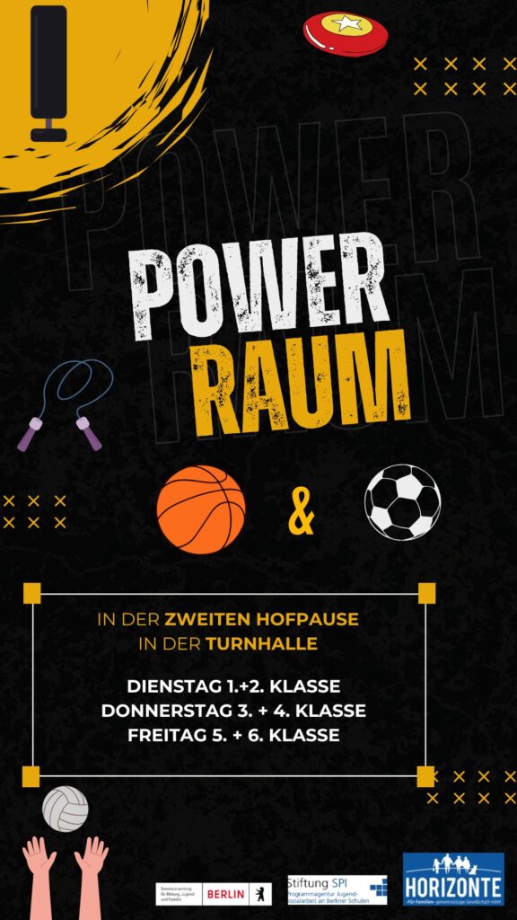 Seit Dezember 2024 läuft das Projekt des Power-Raum an. An drei Tagen in der Woche wird in der großen Hofpause die Turnhalle zur Sportstätte umgewandelt. Alle Schülerinnen und Schüler jeder Altersstufe haben die Möglichkeit an ausgewählten Tagen in den Power-Raum zu kommen. Hier kann sich bei cooler Musik ausgetobt und gespielt werden.